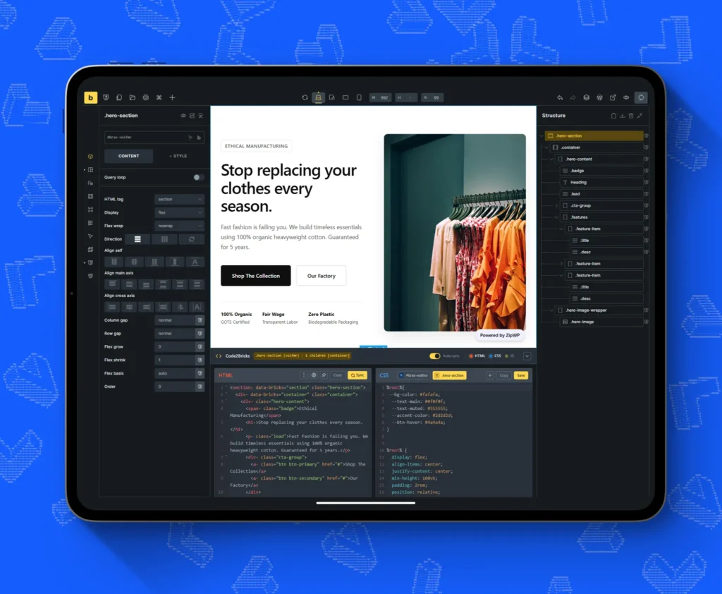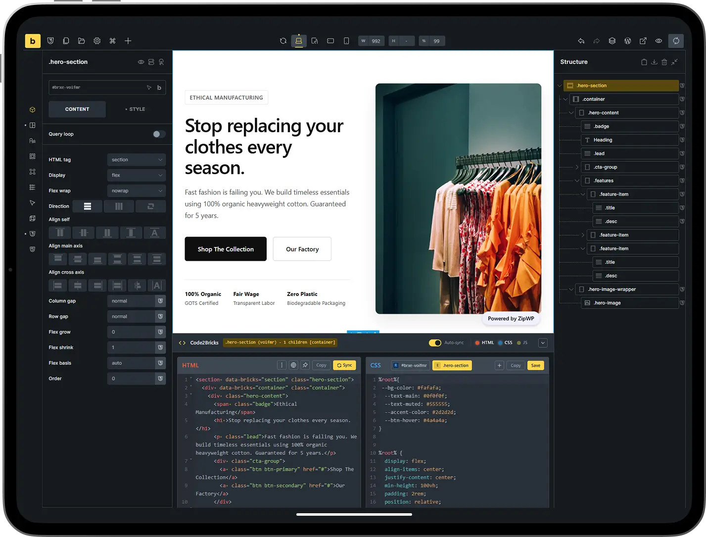 Because clicking "Div" → "Style" → "Layout" → "Padding" takes too long. Code2Bricks gives you HTML, CSS, and JavaScript editors that sync with Bricks in real-time. Type your changes, hit save, and you're done. It's the ultimate dev-experience for Bricks.